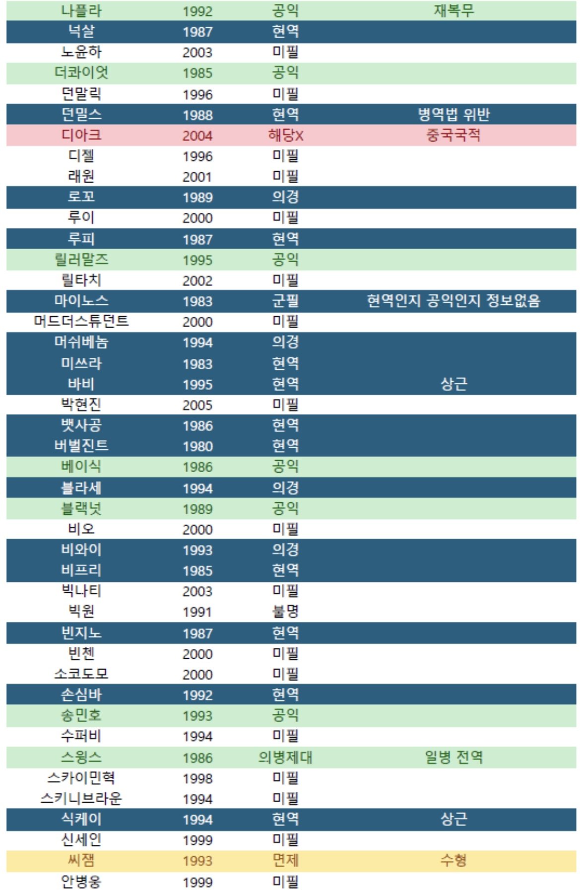 병역의무 해당X 16명 불명(정보없음) 6명