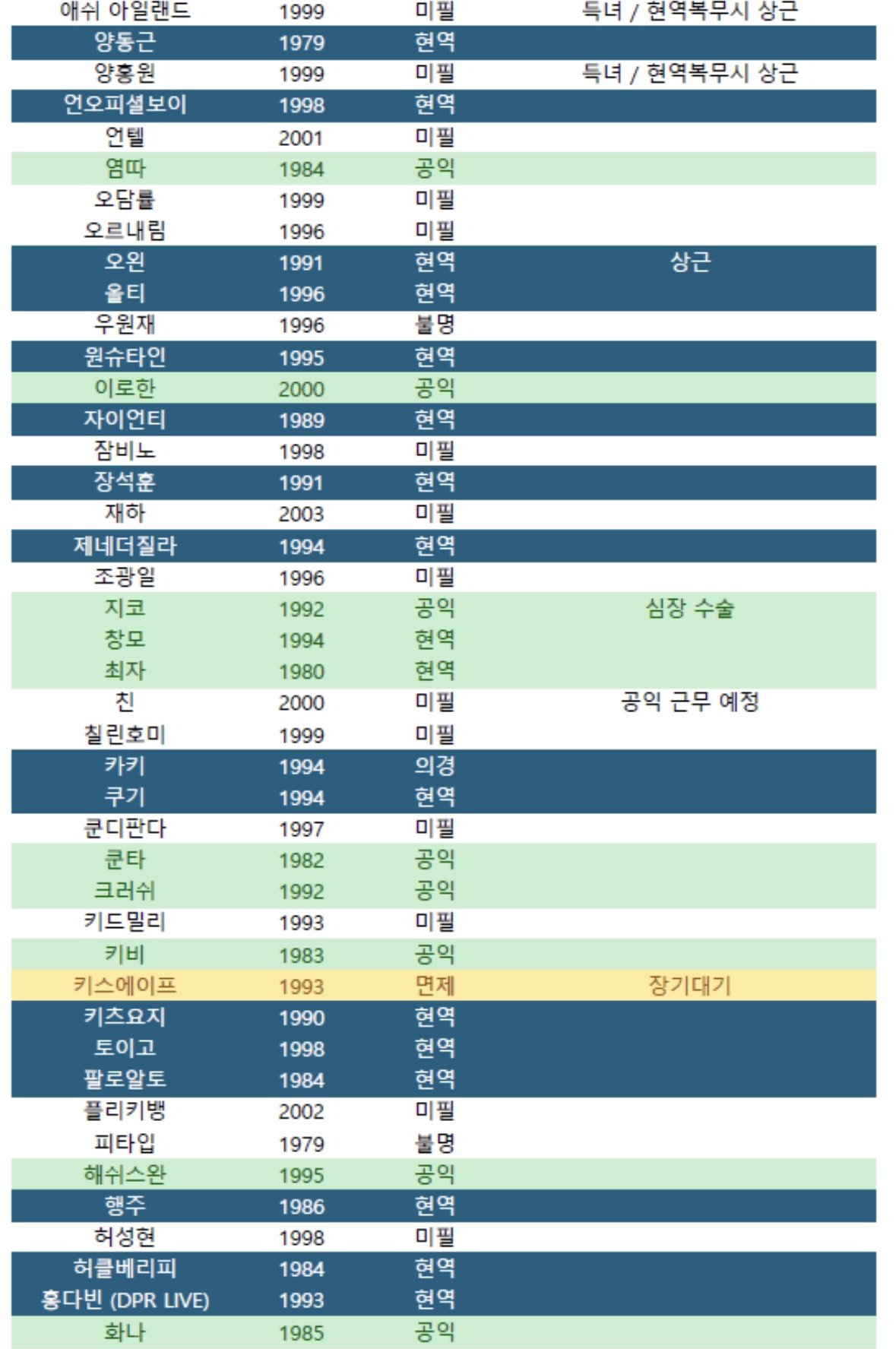 미필 34명 현역 37명 공익 17명 면제 16명 의병제대 1명 방위산업체 1명