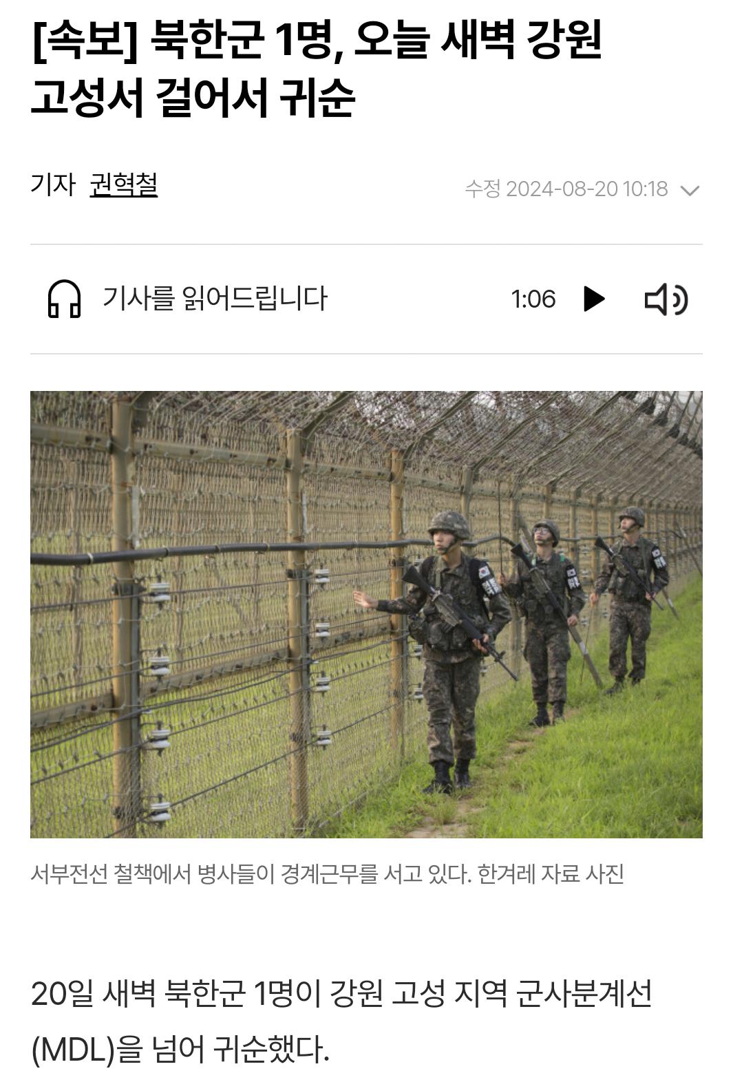 [속보] 북한군 1명, 오늘 새벽 강원 고성서 걸어서 귀순